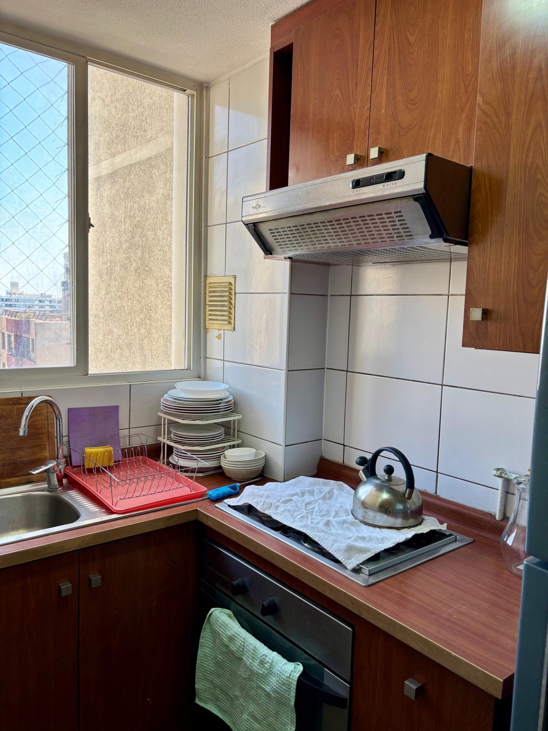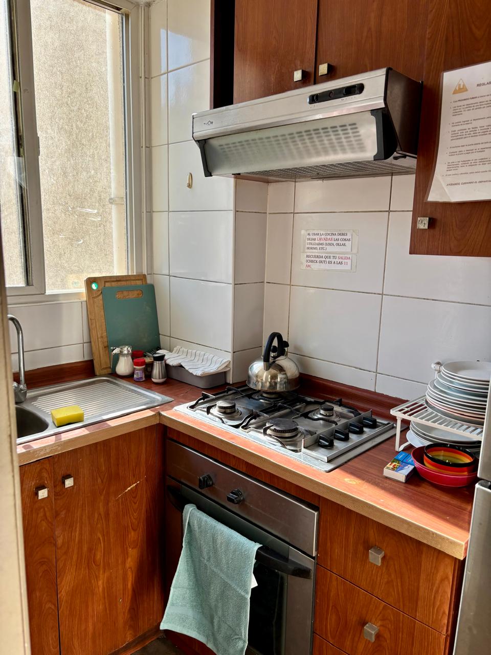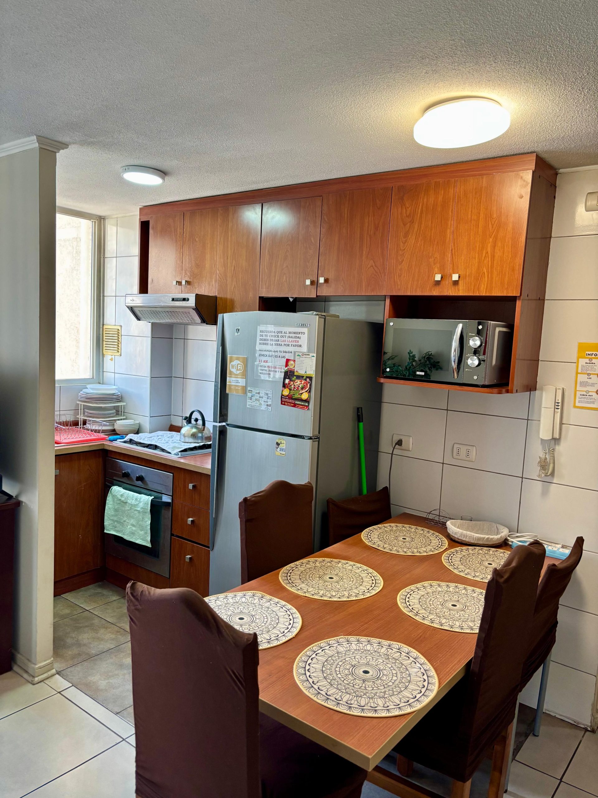 - Cocina equipada con refrigerador, microondas, horno, cocina a gas, utensilios de cocina.