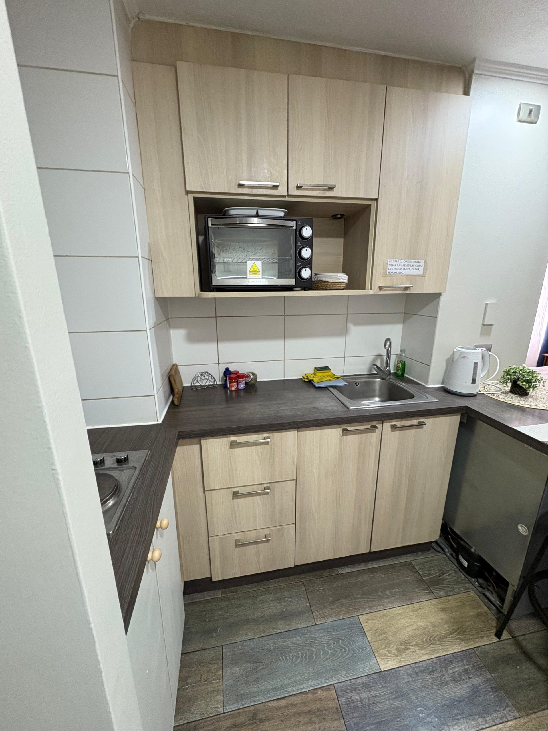 - Cama doble, ropa de cama y toallas. Además tiene cocina equipada con encimera, frigobar, horno eléctrico, hervidor eléctrico y utensilios básicos. En la zona de comedor tiene mesa y sillas altas tipo bar, ideal para las comidas diarias o trabajo remoto. Cuenta también con un sofá cama, tv de pantalla plana, wifi, ventilador y calefactor.